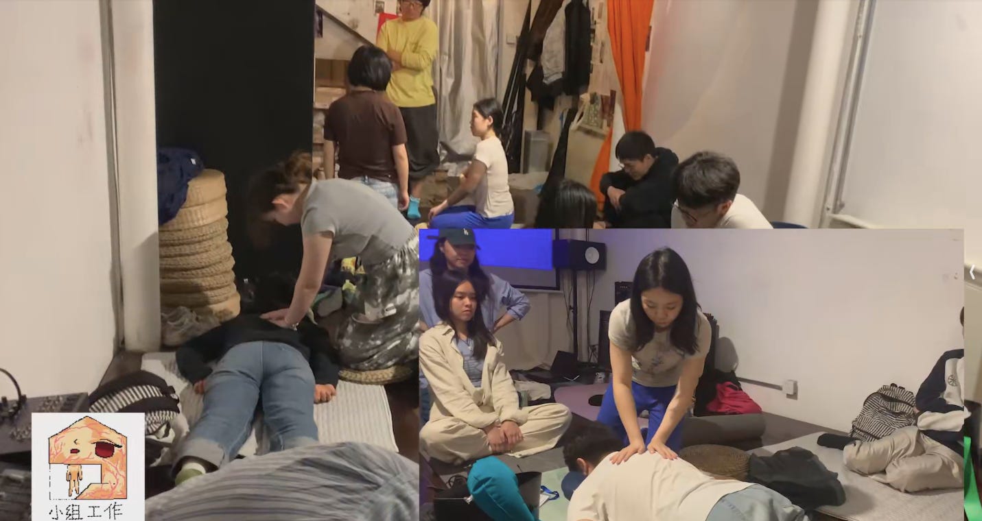 Xiaozu is run by four young creatives: Konini, Zhao Ziyi, Xu Chuxia, and Zhao Xuan, ranging in age from 17 to 28. Together, they are responsible for organizing exhibitions, performances, screenings, workshops, and night classes. As a space that claims to “invent some new work,” xiaozu has its own raw vitality. Compared to other spaces located in commercial or arts districts, most events aren’t overly formal or didactic; instead, they blend artists’ personal styles with public participation in hopes of fostering collective happening and exchange. For example, a recent “massage night school” was initiated by an artist currently studying massage therapy, who hoped to develop new creative ideas through learning and practicing together with members.